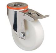 Колесная опора EMES EM04 ZKZ 125 (INOX) устанавливается на платформенные тележки для пищевой промышленности, передвижное медицинское оборудование и технику. Нейлоновый обод хорошо распределяет нагрузку. Поворотный кронштейн изготовлен из нержавеющей стали. Тип крепления — под болт. Максимальная грузоподъемность модели составляет 160 кг. Рабочий температурный диапазон — от -20 до +70 °С.