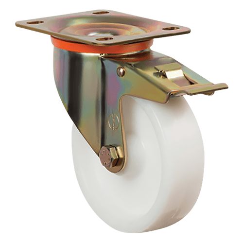 Большегрузная поворотная колесная опора EZ01HBZ100F рассчитана на серьезные эксплуатационные нагрузки, выдерживает до 250 кг. Колесо выполнено из нейлона, кронштейн — из оцинкованной стали. Модель рекомендуется для установки на передвижное оборудование, используемое в пищевой и химической промышленности, где важны стойкость к агрессивным средам и легкость санитарной обработки. Рабочий температурный режим варьируется от -20 до +70 °С. Наличие тормозного механизма обеспечивает надежную фиксацию оборудования в нужном положении и повышает безопасность при эксплуатации.