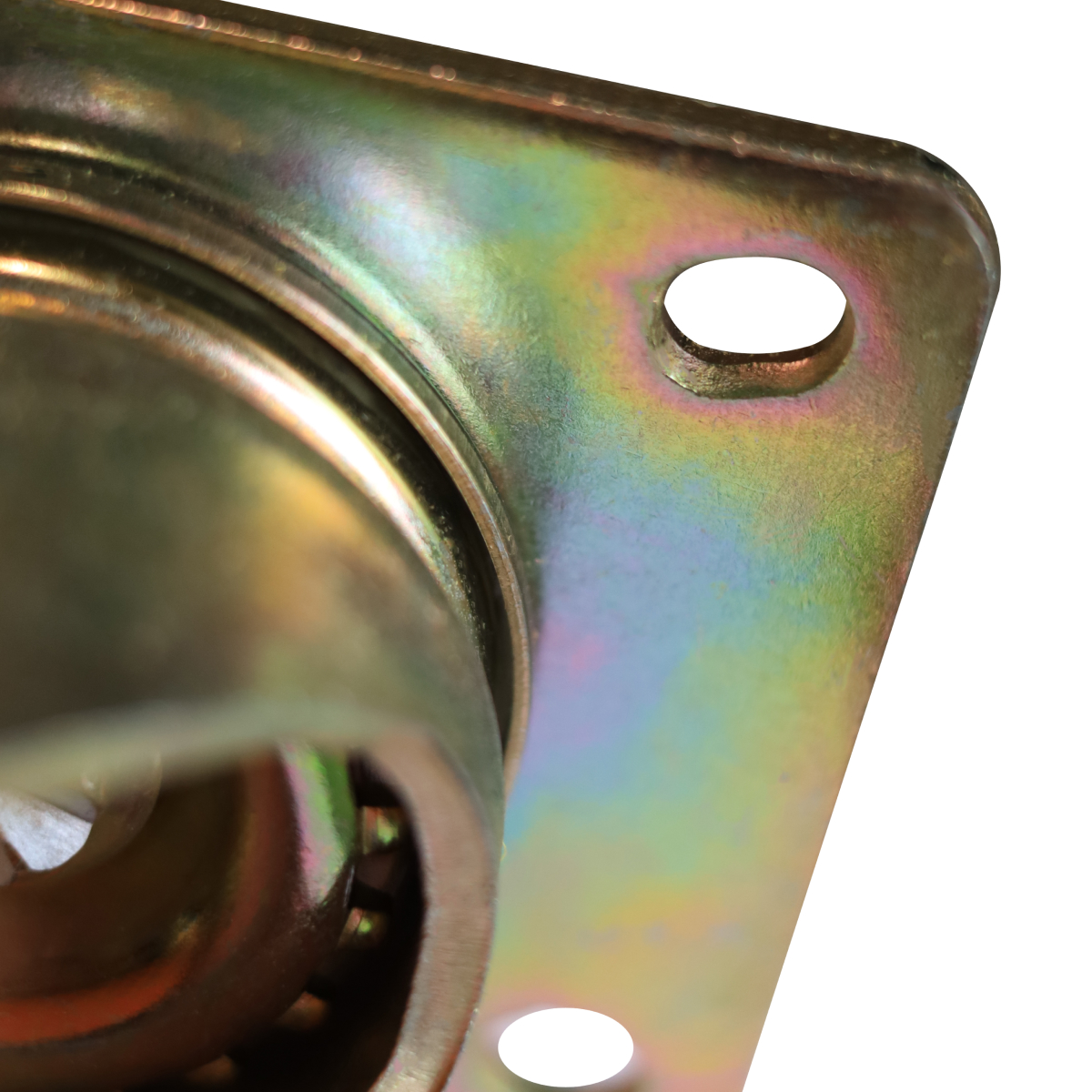 Внутри ступицы установлен шариковый подшипник, который обеспечивает стабильное вращение, уменьшает сопротивление качению. Благодаря этому колесо сохраняет плавность хода даже при максимальной нагрузке. Модель оснащена поворотным кронштейном с четырьмя монтажными отверстиями для болтов, что обеспечивает надежную фиксацию и удобство установки. Дополнительно предусмотрен ножной тормоз, позволяющий исключить самопроизвольное движение оборудования во время остановки.