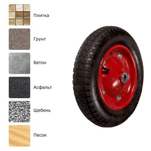 Грузоподъемность данного пневматического колеса составляет 180 кг, диаметр — 360 мм. Модель отличается высокой проходимостью, может использоваться на рыхлых неровных поверхностях (песок, щебень и т. п.), подходит для строительных и садовых тачек.