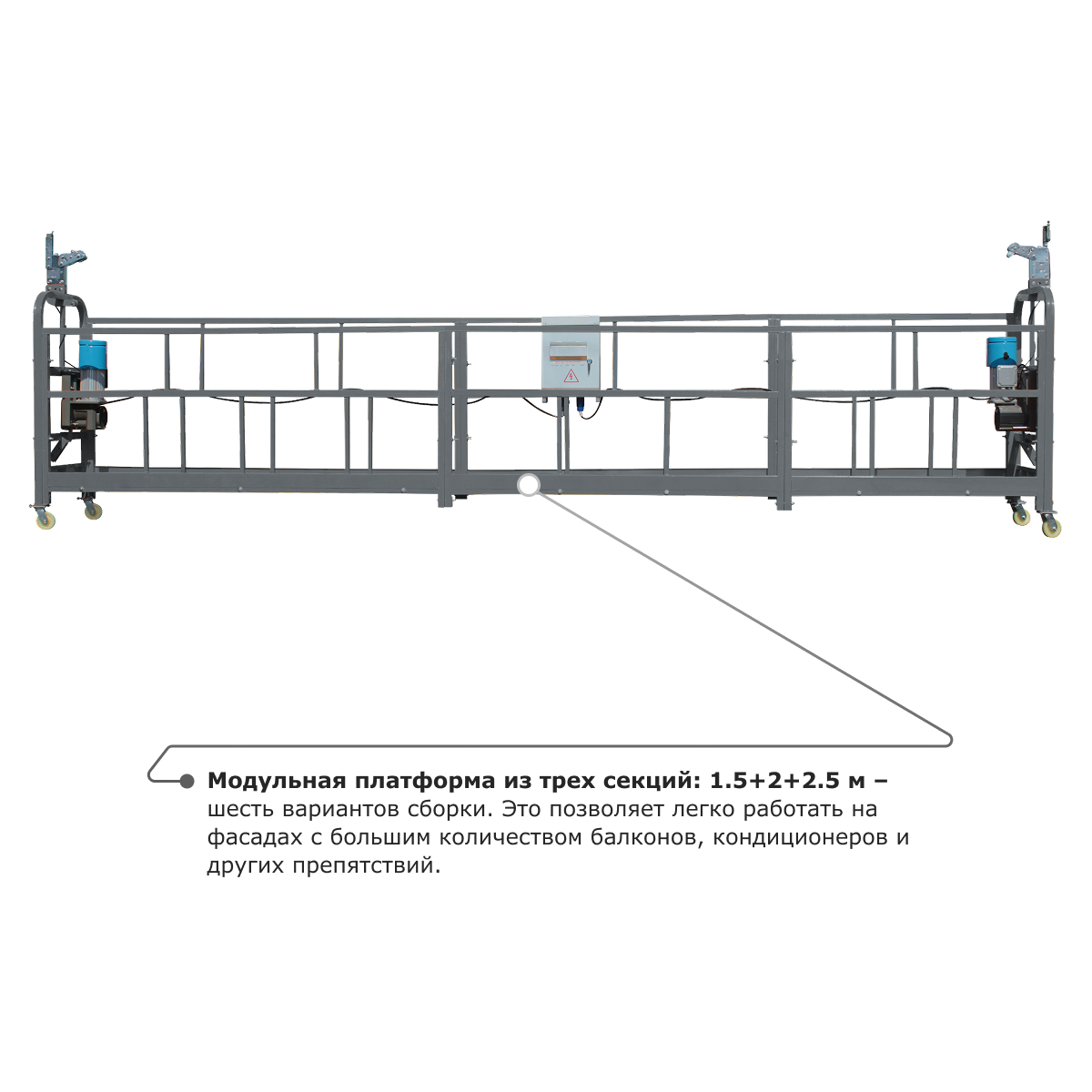 • Модульная платформа из трех секций: 1.5+2+2.5 м – шесть вариантов сборки. Это позволяет легко работать на фасадах с большим количеством балконов, кондиционеров и других препятствий.
