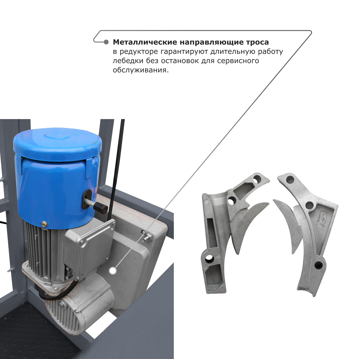 • Металлические направляющие троса в редукторе гарантируют длительную работу лебедки без остановок для сервисного обслуживания.