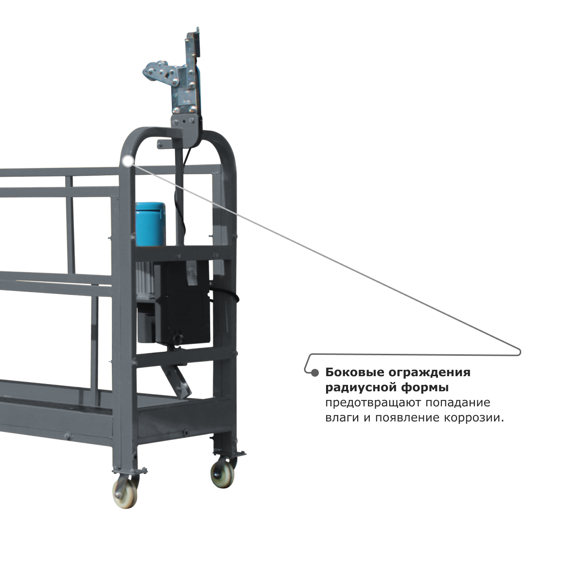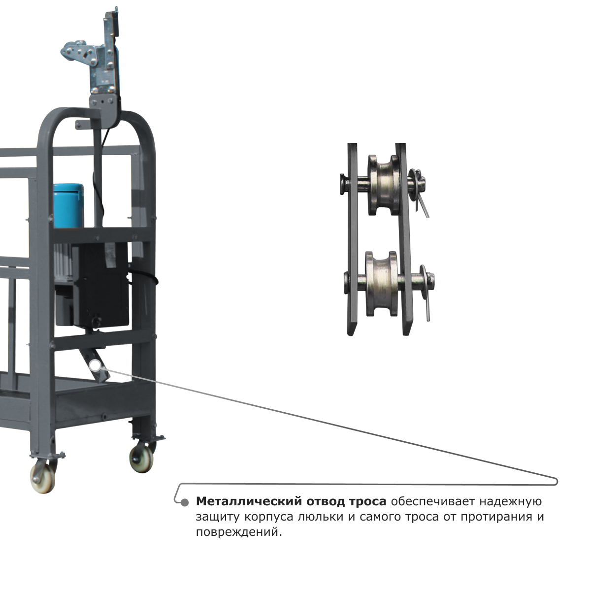 • Металлический отвод троса обеспечивает надежную защиту корпуса люльки и самого троса от протирания и повреждений.