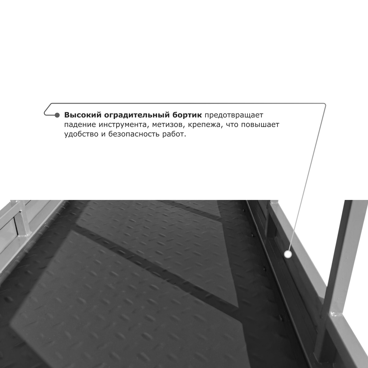 • Высокий оградительный бортик предотвращает падение инструмента, метизов, крепежа, что повышает удобство и безопасность работ.