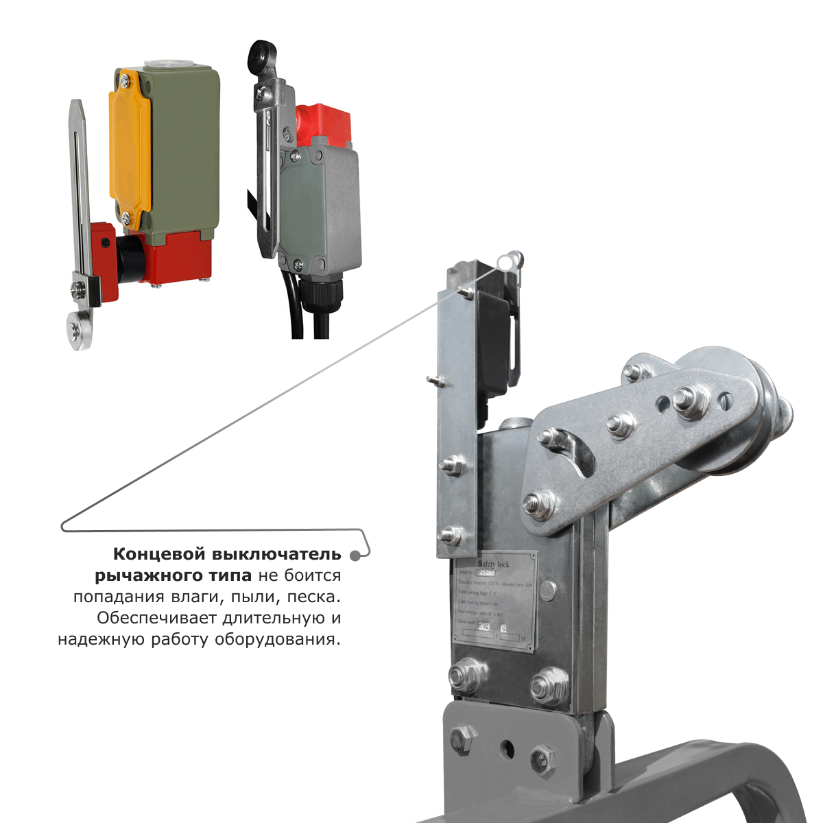 • Концевой выключатель рычажного типа не боится попадания влаги, пыли, песка. Обеспечивает длительную и надежную работу оборудования.